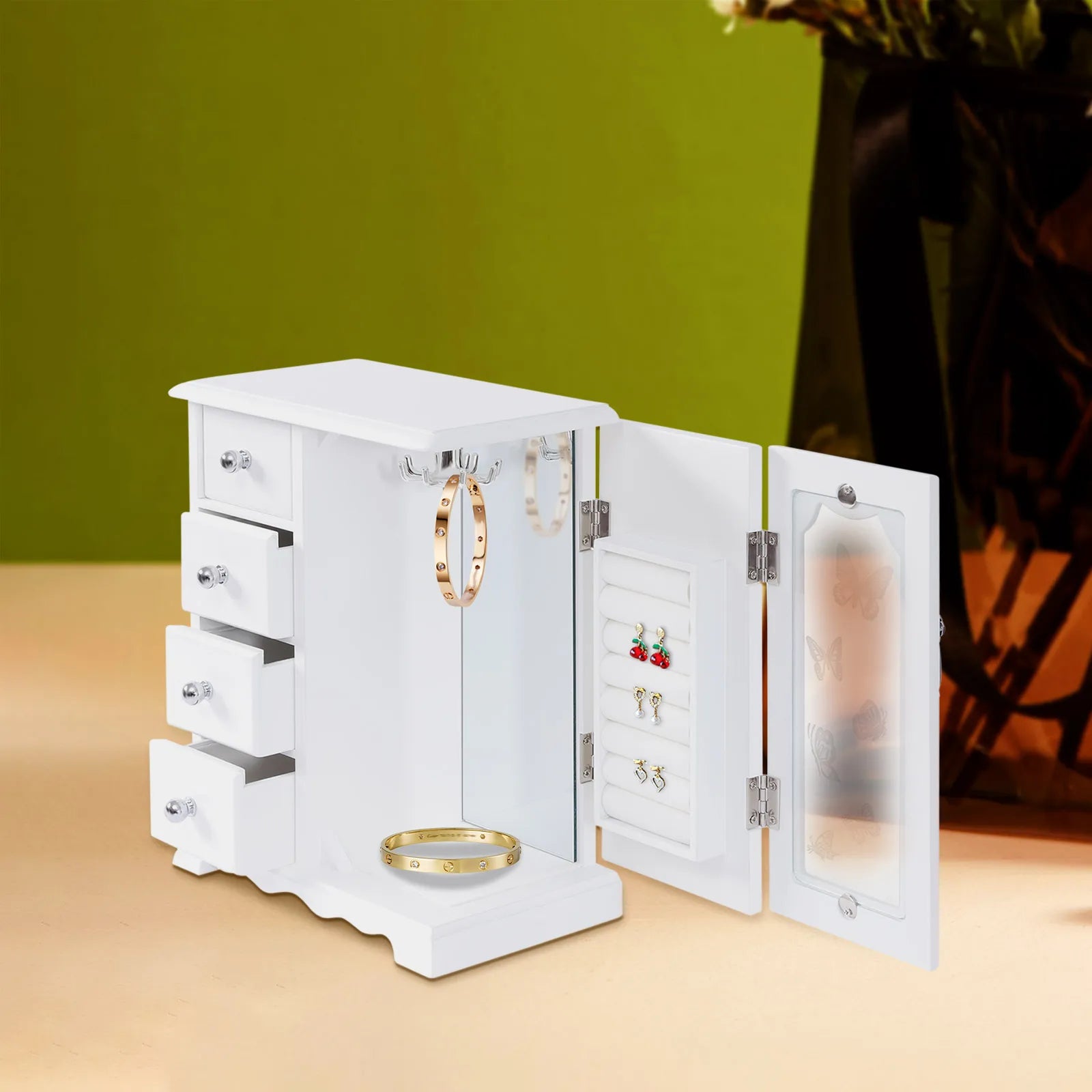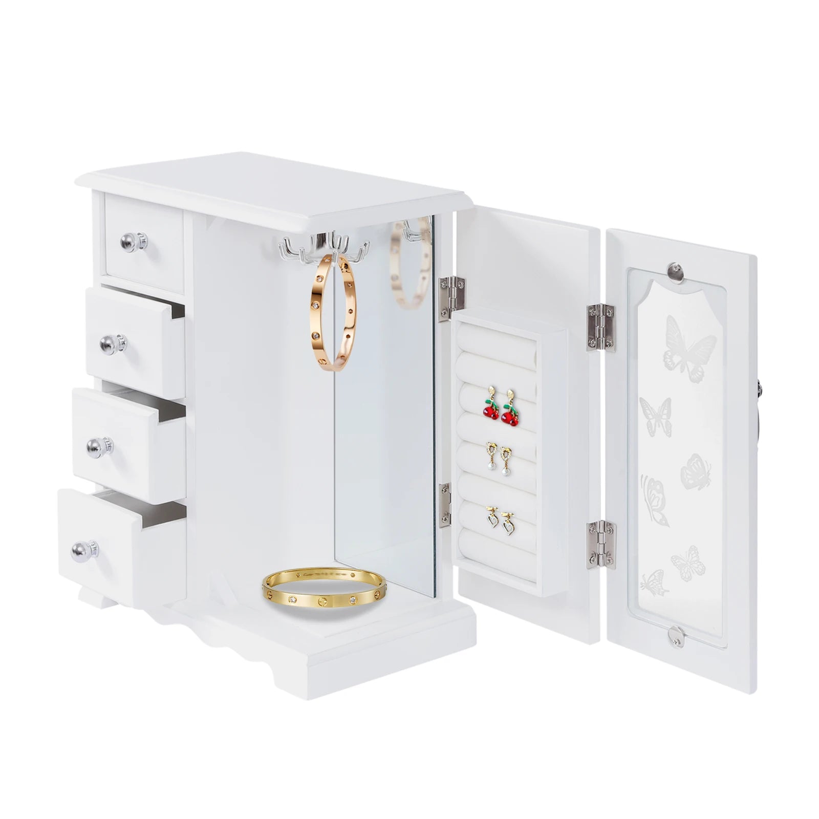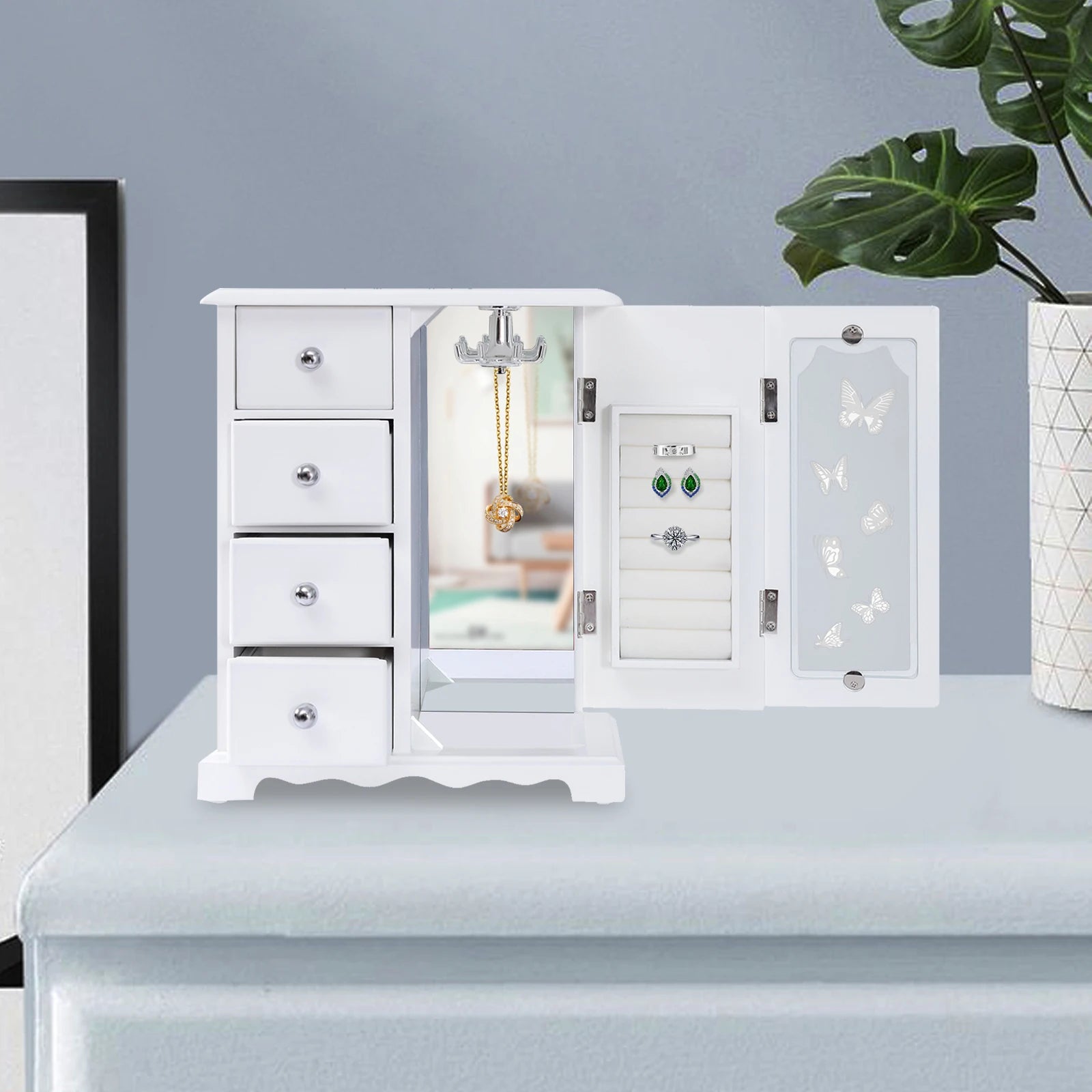 Jewelry Box with 4 Drawers Organizer and Built-in Necklace Carousel and Large Mirror, Jewelry Storage Box White